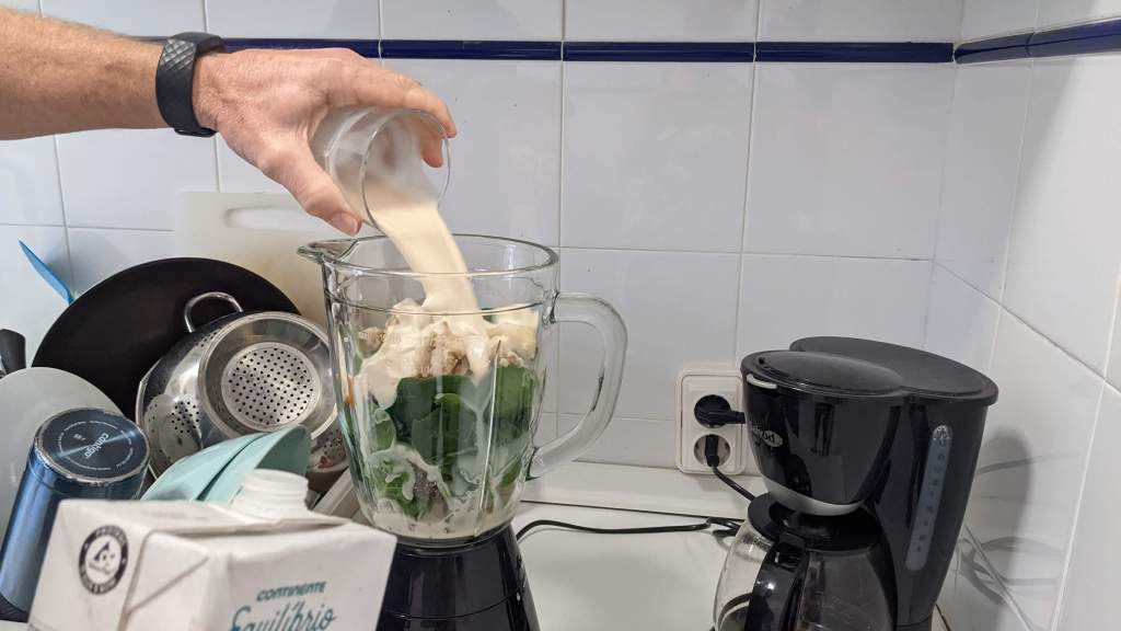 Tip: Put ice on bottom if your blender is shit, like ours. Use gravity by putting bananas last to help push the concoction down into the blender blades. Pour Almond milk last.