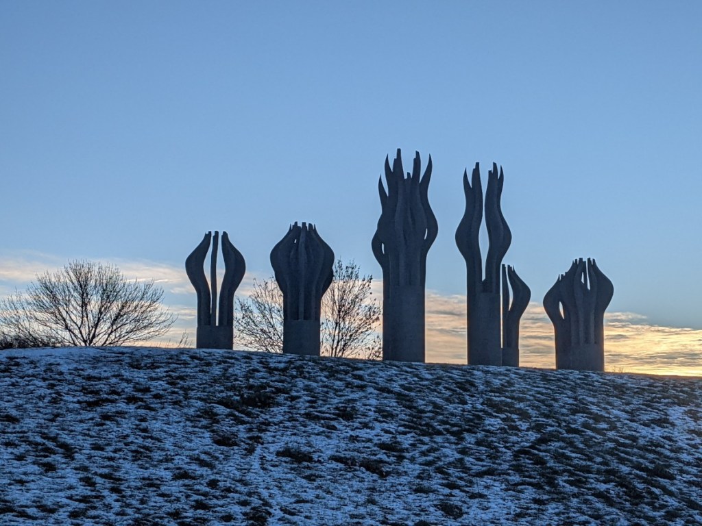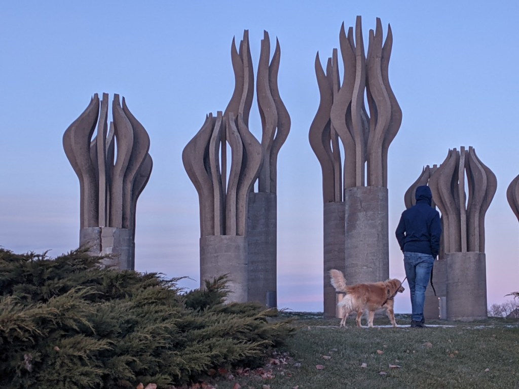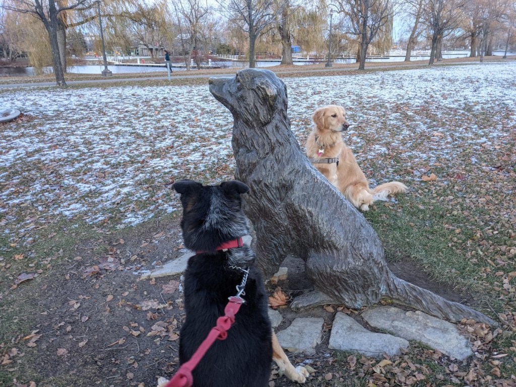 After that, somewhere to walk and tire out the dogs before the flight. We found Parc René-Lévesque, (again, right near the airport), and it was way more than we were hoping for. Not only a nice walk for the dogs, but it was beautiful with gorgeous views along the St. Lawrence River. Only wish it’d been 50° warmer!
