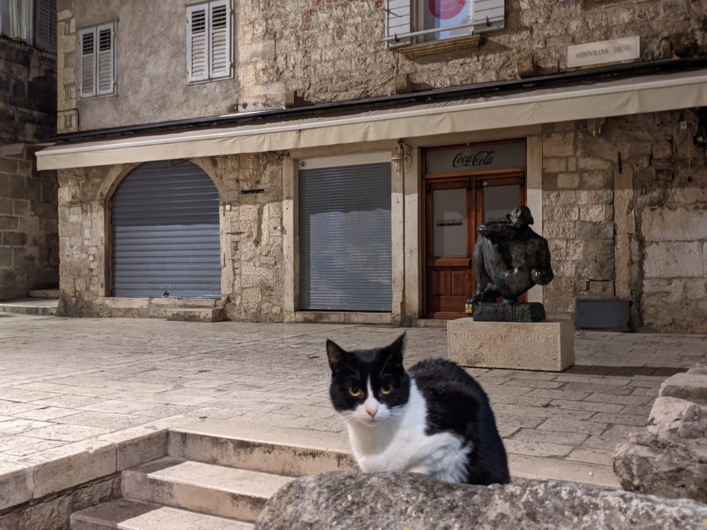 Reality: I need more time and information to decide about this. People in Split aren’t really friendly, but they get bombarded with tourists, so a couple of off-season travelers might not be that interesting…it may be different in Orebic. The older men stand out as the most cheerful/happy people (within their own group of buddies on the park benches and restaurants) in Split. Many people have dogs here and walk them without leashes, usually without any problems for their dogs or others. TONS of feral cats here.