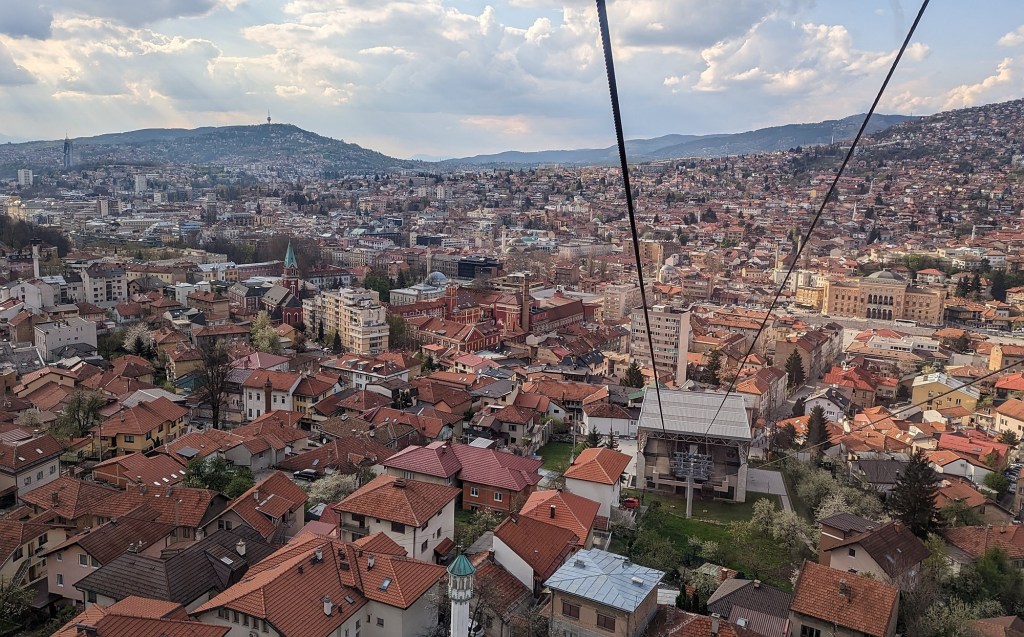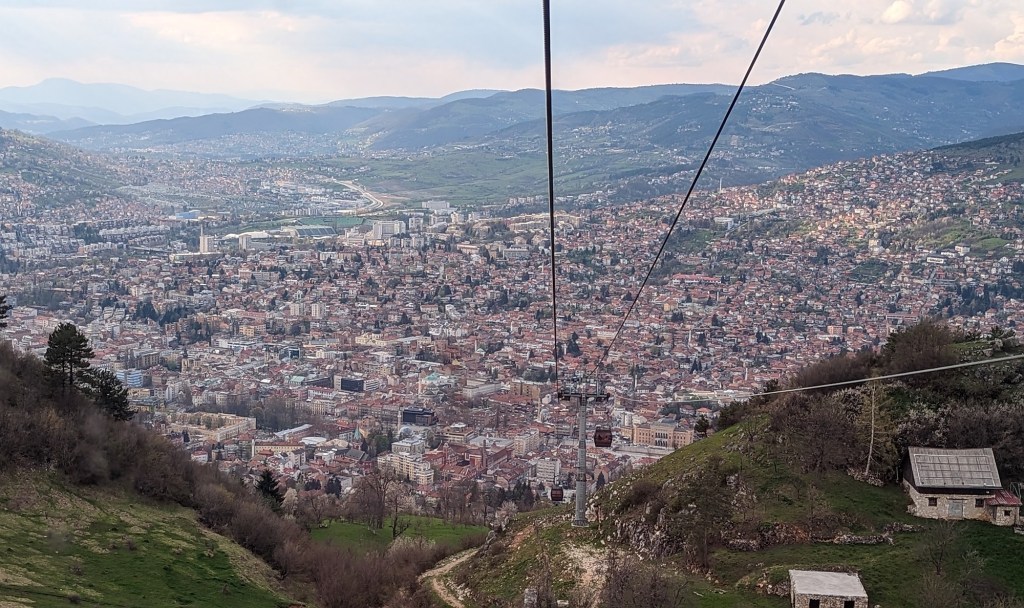 In the book, you learn about the “men in the hills”. They are not named, but we learned that these were the Serb and Bosnian Serb aggressors. In the aforementioned podcast interview, we learned that before it actually happened, people in the city had no idea that war was about to break out. What they did know was that there were men in the hills with heavy equipment “making repairs” to the roads, to the towers, etc. It turns out that the men were from Serbia, and they weren’t there to make repairs, they were there to fortify the hills for a siege. Bosnia had, like Montenegro before it, declared its independence from Yugoslavia. Serbia thought they could quickly force Sarajevo into a surrender and the rest of the country would fall in line. As we rode the cable car into the hills – the same cable car line that had been used for the 1984 Olympics but dismantled a scant six years later during the war – we couldn’t help but look down onto the topography and try to pinpoint where the “men in the hills” had set up their artillery and their sniper nests.