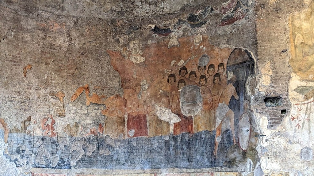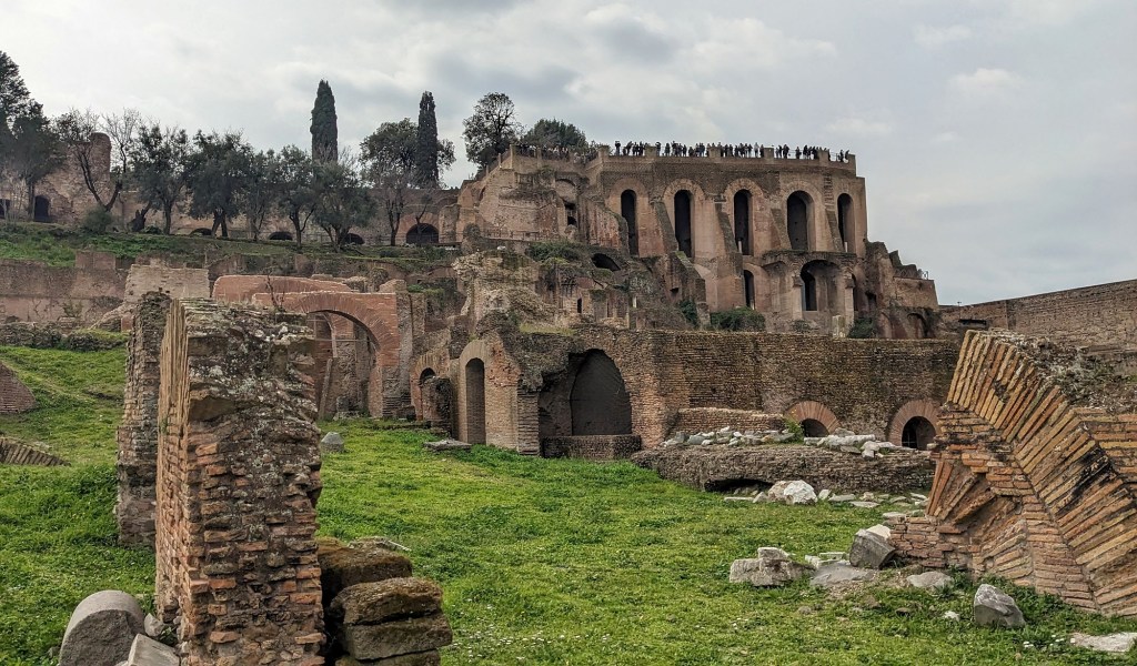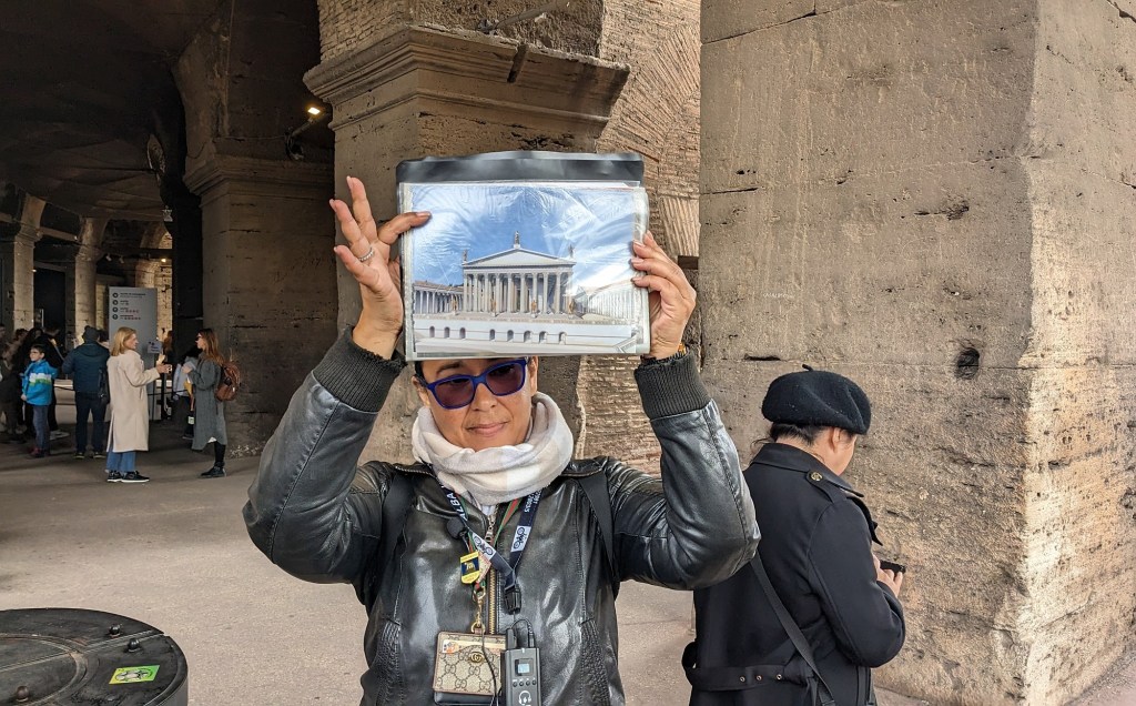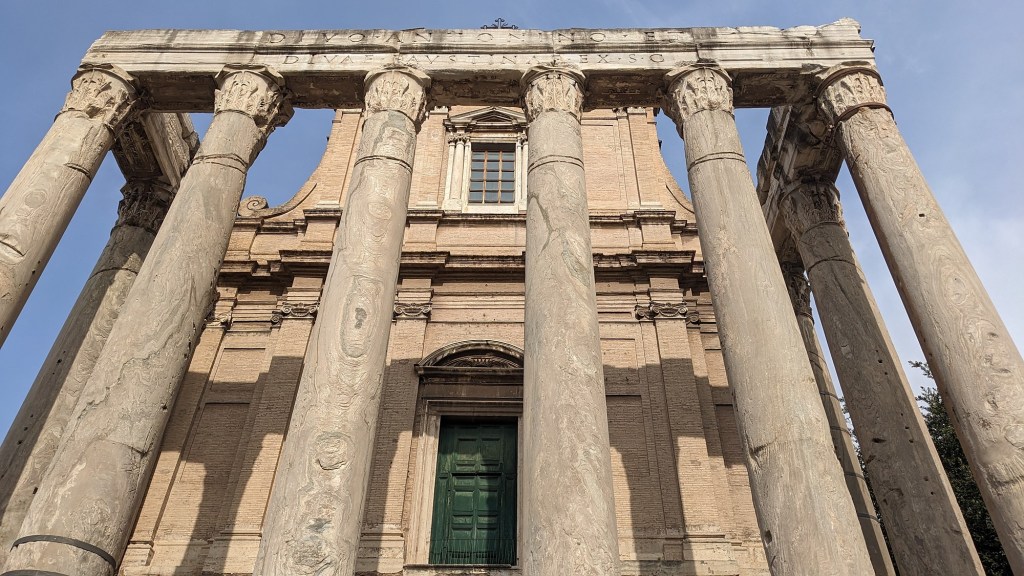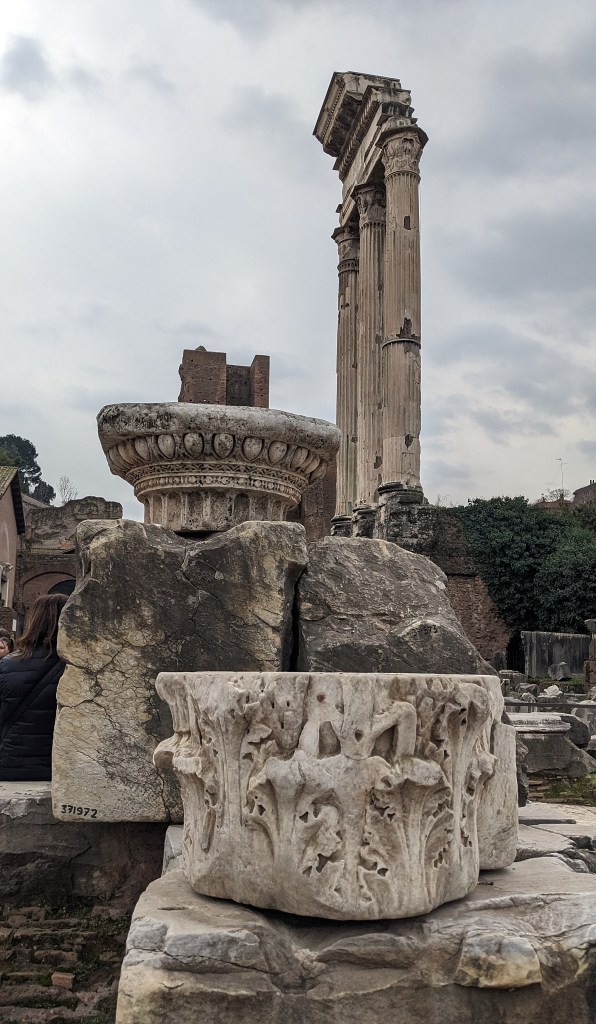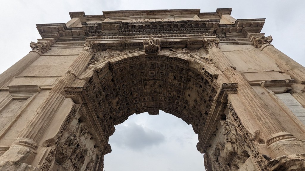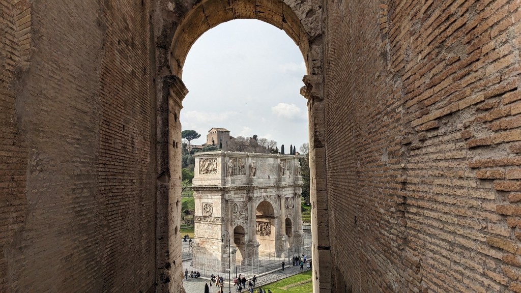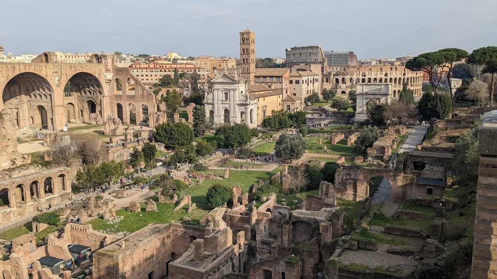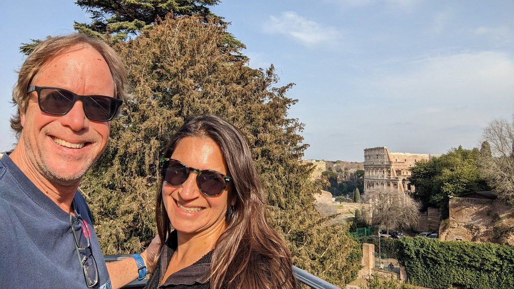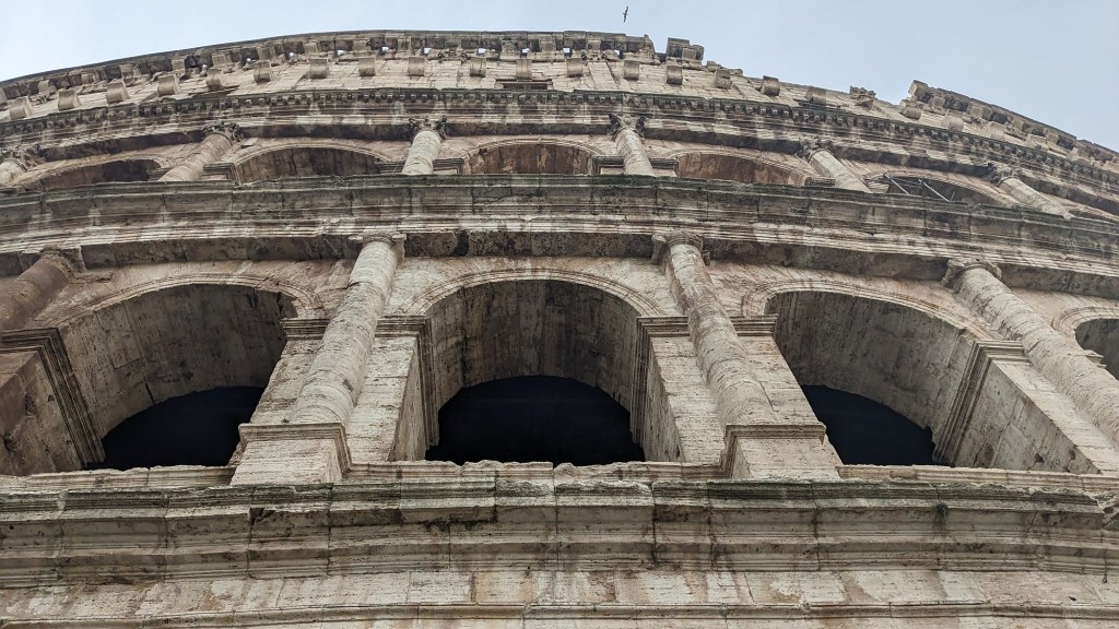 After waking up early, getting the dogs situated, and picking up cappuccinos and croissants from the bakery across the street, we took the metro to the meeting point for today’s tour: City Walks’ Skip the Line: Premium Colosseum Tour with Roman Forum & Palatine Hill. Luckily we arrived early because after exiting the metro station we had a hard time following the provided directions to the tour meeting spot at the entrance to the Colle Oppio Park. We would probably have done better just following Google Maps. Even so, we were one of the first to arrive and we had a chance to duck into Oppio Caffe for another cappuccino, this time with a delicious muffin. It’s all about the sustenance 🙂 Despite the less-than-auspicious beginning, the tour itself was excellent! This was the first guided tour I’d ever been on, and the first that John and I had been on as a couple. We generally like to move along at our own pace and avoid groups wherever possible, but we knew that with limited time in Rome (and the hordes of tourists, even in February) doing a skip-the-line was the way to go. I’m so glad we did! We had very limited wait to get into the attractions and our guide was full of facts that we’d never have learned otherwise. She also brought visual aids — a flip book/binder showing what the ruins we were seeing looked like now vs. what they would have looked like in their prime. It was very cool. Based on this experience and the following day’s tour, I highly recommend the City Experiences’ Walks.